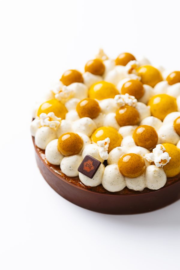 croustillant noisettes et riz soufflé, compotée mangue/passion, crémeux mangue au poivre de Sarawak, biscuit vanille, crème montée vanille au pop corn